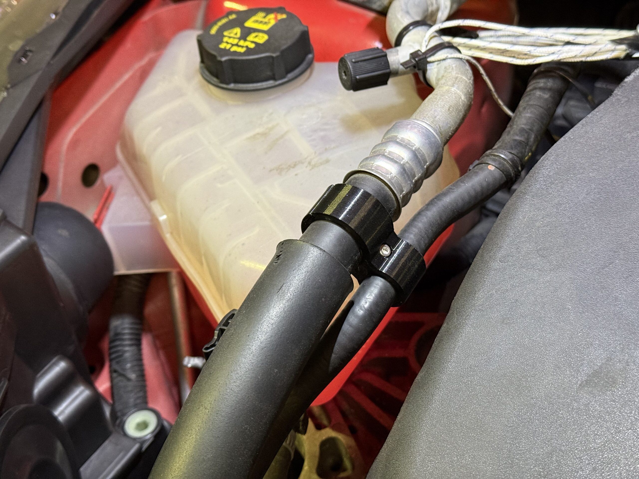 Fixing the hose eliminates strain put on the plastic end of the hose at the coolant tank. Please note that this bracket will only fit the default supplied hose by Turbotechnics.